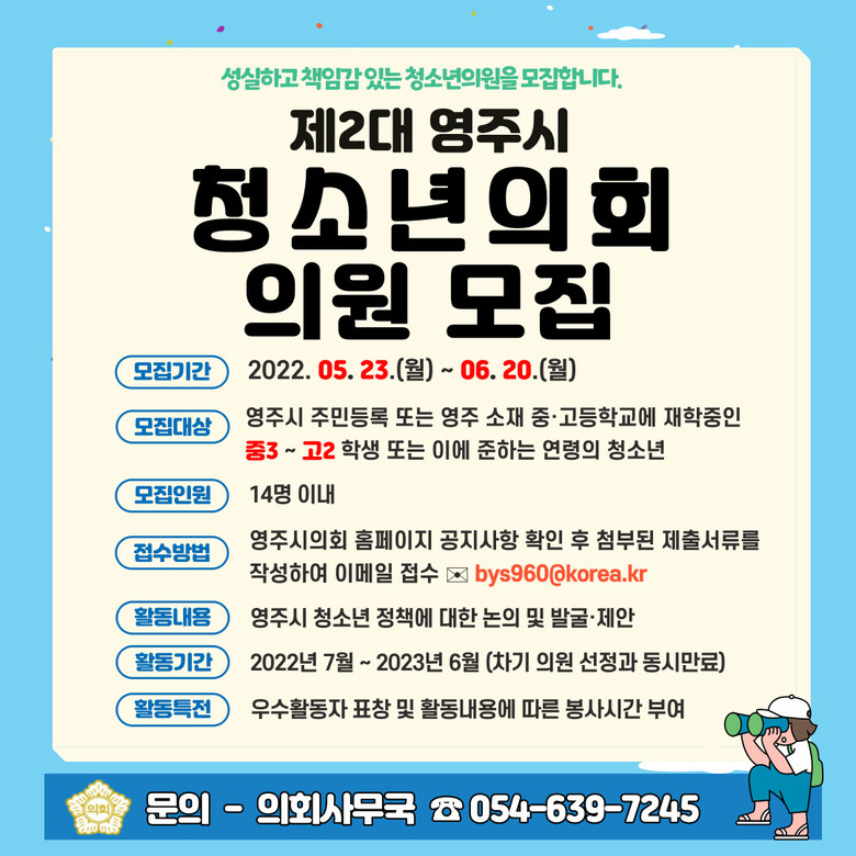 [영주시=세계타임즈=한성국 기자] 영주시의회는 청소년의 참여권과 자치활동 지원을 위해 5. 23일부터 ~ 6. 20일까지‘제2대 영주시 청소년의회’의원을 모집한다고 밝혔다.