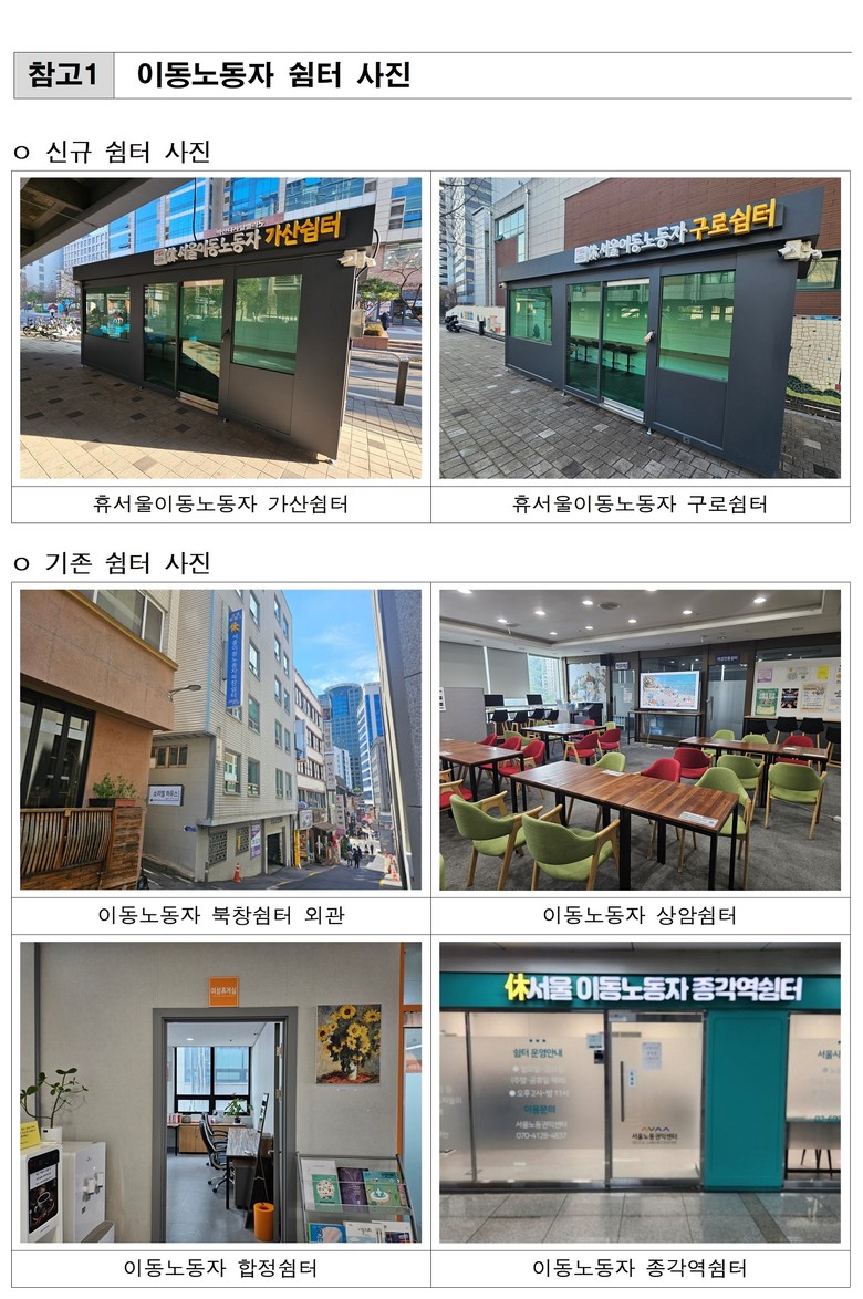 아울러 서울시는 혹한기 이동노동자의 이용 편의를 높이기 위해 12월 20일(토)부터 2026년 2월 1일(일)까지 약 6주간 서초·북창·합정·종각역·사당역 쉼터 5개소를 대상으로 주말까지 운영을 한시적으로 확대한다. 주말에도 쉼터를 개방해 겨울철 야외 활동이 많은 이동노동자가 보다 안정적으로 휴식을 취할 수 있도록 지원할 계획이다.