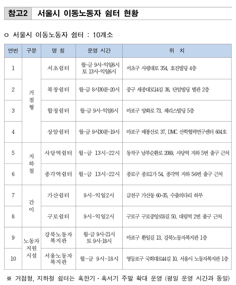 서울시는 이번 새로 조성된 가산쉼터와 구로쉼터를 포함하여 10곳의 이동노동자 쉼터를 운영하고 있으며, 자치구에서는 20곳의 이동노동자 쉼터를 운영 중이다. 서울시 내 총 30곳의 이동노동자 쉼터 위치와 운영시간 등 자세한 정보는 서울노동포털(www.seoullabor.or.kr)에서 확인할 수 있다.