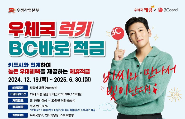 ‘우체국 럭키 BC바로 적금’은 최고 연 3.3% 금리 혜택에 카드 이용실적에 따라 특별 리워드 7%를 주는 상품으로 6월 30일까지 6만 계좌 한정으로 특별 판매 중인 상품이다.