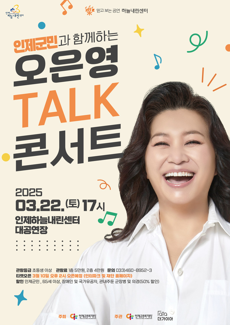 인제군문화재단(이하 재단)은 오는 3월 22일 토요일 오후 5시 인제 하늘내린센터에서 ‘오은영의 토크콘서트’를 개최한다고 밝혔다.