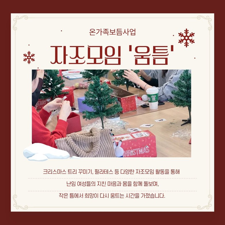 ‘움틈(새로운 시작과 희망)’은 저출산 문제 대응 및 가족의 건강한 삶 지원이라는 사회적 요구를 반영하여 난임 여성 맞춤형 프로그램으로 올해 새롭게 기획되었다.