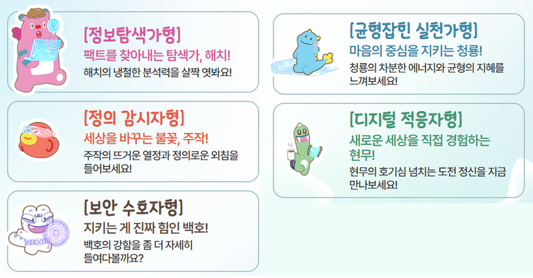 해치와 소울프렌즈 캐릭터별 에피소드는 ▲해치 편(허위정보·딥페이크 판별) ▲현무 편(개인정보 보호·접근 권한) ▲주작 편(온라인 갈등·혐오 표현) ▲백호 편(계정 보안 강화·피싱 예방) ▲청룡 편(디지털 웰빙)을 주제로 구성됐다.