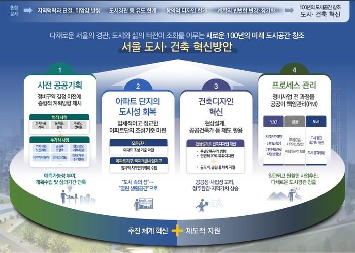 이번 도시·건축혁신안의 핵심은 정비사업에 대한 공공의 책임 있는 지원을 위한 '뉴 프로세스' 실행, '사전 공공기획' 단계 도입, 아파트 단지의 도시성 회복, 건축디자인 혁신 등 4가지다.
