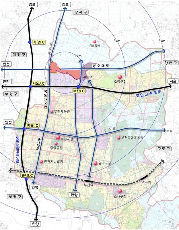아울러, 경인고속도로 부천IC에 인접하고 김포공항이 직선거리 5km 이내로 위치하며, 인천에서 서울과 직결되는 봉오대로 및 서울외곽순환고속도로가 인근에 있어 사통팔달 광역교통망을 바탕으로 대도심 접근성이 매우 우수해 수도권 서북부 핵심지역으로 성장하고 있다.