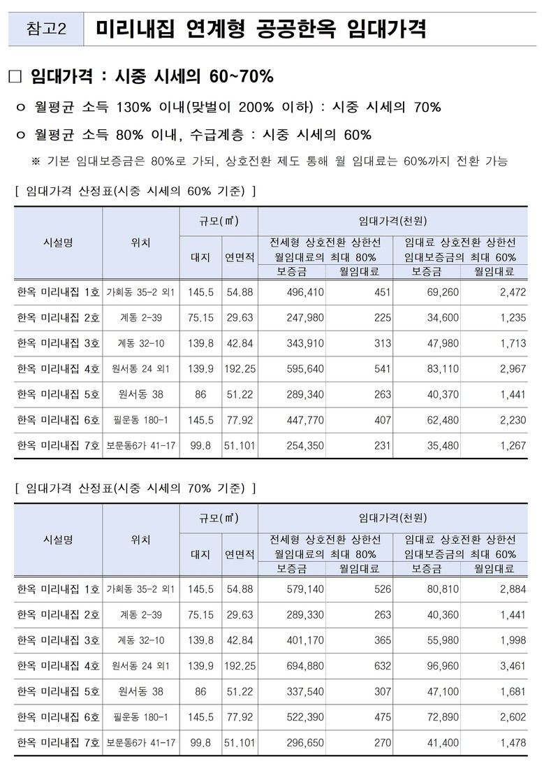 신혼.신생아 매입임대주택Ⅱ 방식을 준용해 임대료가 시세 대비 저렴한 ‘미리내집 연계형 공공한옥’은 상호전환 제도를 통해 가구별 자금계획에 맞춰 임대보증금과 월 임대료 비율을 조정할 수 있다. 특히 거주 중 자녀 출산 시 10년 거주 후 ‘장기전세주택’으로 우선 이주 신청할 수 있는 혜택이 주어진다.