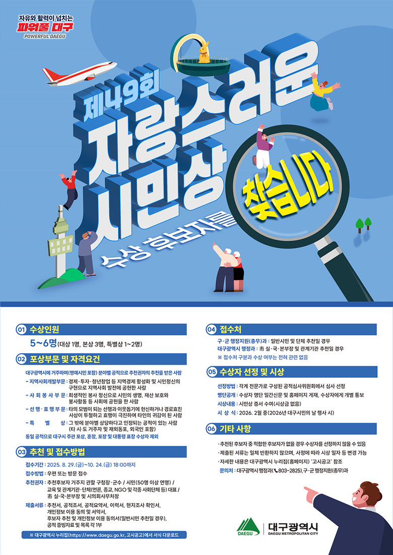 ▸ 10월 24일까지 공개모집, 12월 최종 선정, 내년 2월 대구시민의날 시상