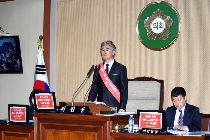[양구군=세계타임즈 김민석 기자] 제248회 양구군의회 임시회 예결특위 제5차 회의가 10일 양구군의회 본회의장에서 열린 가운데 신철우예결특위위원장, 의원들이 춘천~속초 동서고속화철도 조기착공을 호소하는 어깨띠를 두르고 있다.