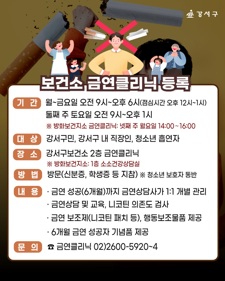 금연클리닉은 직장인·청소년 흡연자를 대상으로 평일 오전 9시부터 오후 6시까지 강서구보건소(공항대로 561)에서 진행하며, 직장인 편의를 위해 매월 둘째 주 토요일 오전 9시부터 오후 1시까지 추가 운영한다.