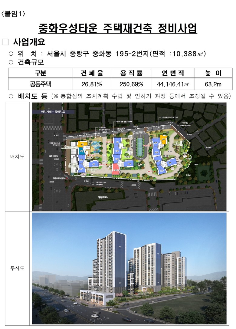 최진석 서울시 주택실장은 “중화우성타운은 저층주거지와 인접한 특성을 고려해 주민과 어우러지는 새로운 주거단지로 탈바꿈한다”며 “신속한 재건축 추진으로 주택 공급을 촉진하고, 지역주민과 함께 하는 열린 단지를 확대하겠다”고 말했다.