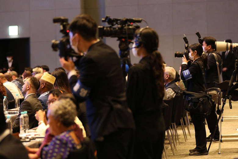 18일 HWPL 9·18 평화 만국회의 제9주년 기념식 행사장에서 HWPL 행사운영국 방송스태프들이 콘퍼런스 현장을 촬영하고 있다.