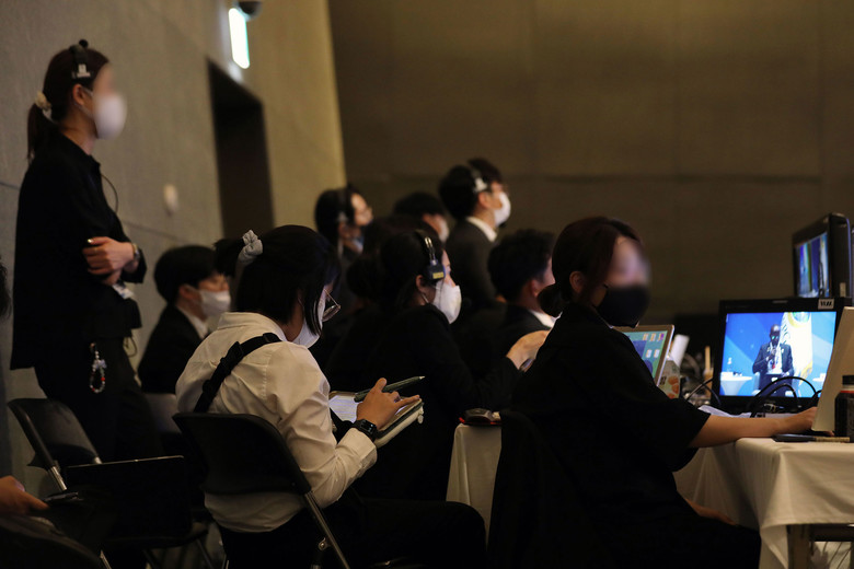 [세계타임즈 = 백진욱 기자] 9월 18일 HWPL 9·18 평화 만국회의 제9주년 기념식 행사장에서 HWPL 행사운영국 방송스태프들이 콘퍼런스 진행 상황을 모니터링하고 있다.