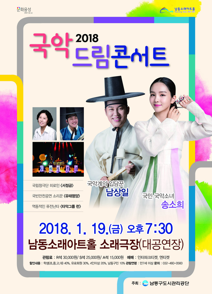 ⦁ 인천 남동소래아트홀(남동구도시관리공단, 이사장 김종필)이 올해 첫 기획공연으로 ‘2018 국악드림콘서트’를 개최한다.