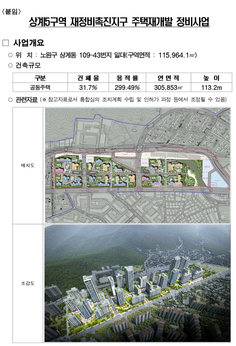 상계5구역은 다가구·다세대 위주 노후불량주택이 밀집돼 주거환경이 열악하고 노후도에 따른 안전 우려가 지속 제기됐던 곳이다. 그러나, 2009년 조합설립 이후 사업이 표류했으나 이번 통합심의 통과로 본격 추진된다.