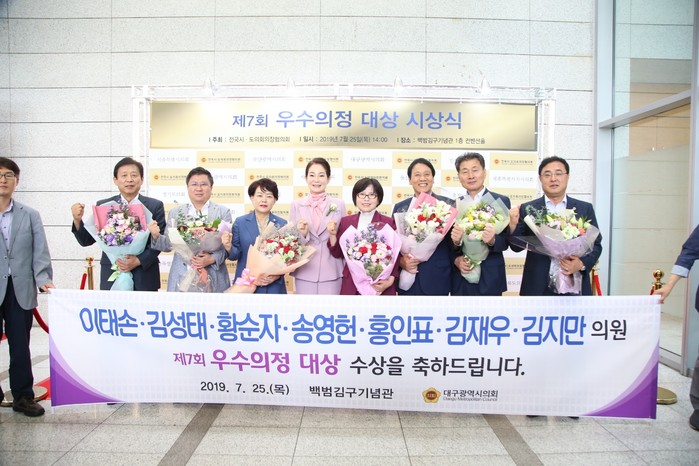 대구시의회 김지만, 김재우, 홍인표, 이태손, 김성태, 황순자, 송영헌 의원 등 7명의 의원들은 전국시·도의회의장협의회가 주최한 ‘제7회 우수의정대상’ 수상자로 선정되어, 7월 25일 오후 2시 백범김구기념관 컨벤션홀(서울 용산구)에서 시상식을 가졌다.