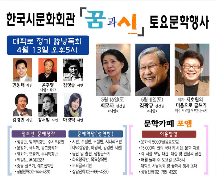 ‘마음으로 글쓰기 강좌’는 4월부터 매주 토요일 2-4시, 두 시간 동안 3개월 12주 과정으로, 대학로에 있는 한국시문화회관에서 진행된다.