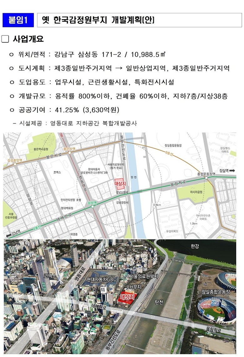 대상지는 삼성동 171-2번지에 위치한 옛 한국감정원 부지로, 국제교류복합지구 중심부에 자리한 전략적 요충지이다. 해당 부지를 국제업무·비즈니스·문화 기능이 집적된 거점 공간으로 조성하기 위해 도시관리계획을 수립하게 되었다.