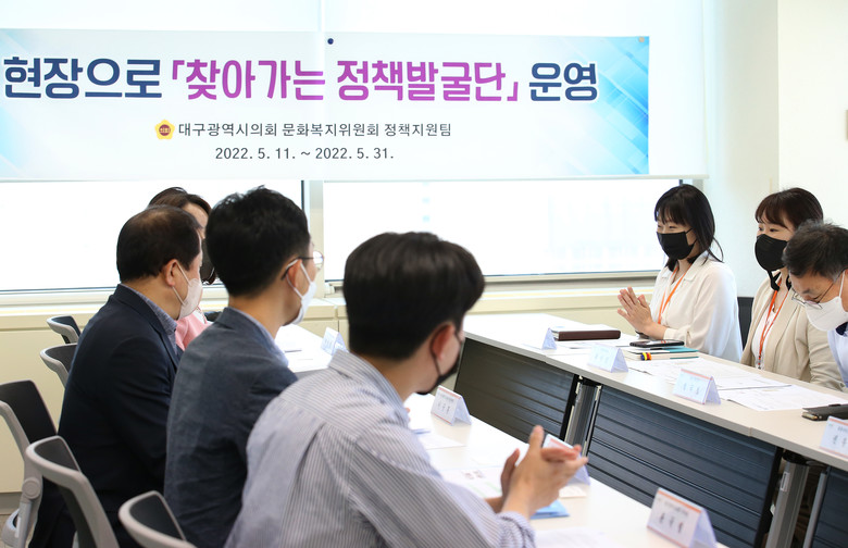 ‘찾아가는 정책발굴단’은 올해부터 대구시의회에 도입된 정책지원인력(정책지원팀)을 활용해 처음 실시하는 제도이다. 정책발굴단은 고충과 애로사항을 직접 표출하는데 어려움이 있는 시 산하 출연기관 및 원거리 근무자와의 소통을 강화하여 현장의 운영상황을 의회의 관점에서 살펴보고, 다양한 현장의 소리를 들어 대화 문화 정착 및 공감 정책을 실현하고 나아가 먼저 다가가는 열린 의정활동을 구현하고자 계획되었다.