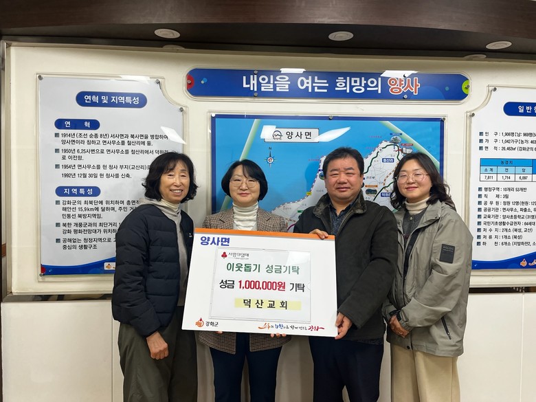 [강화군 세계타임즈=심하린 기자] 강화군 양사면(면장 이지영)은 지난 23일, 양사면 이장단(단장 조재현), 인화1리 주민 일동(이장 이상도), 덕산교회(권회철 목사)에서 성탄절을 맞아 각각 성금 100만 원을 기탁하며 이웃사랑 실천에 동참했다고 전했다.