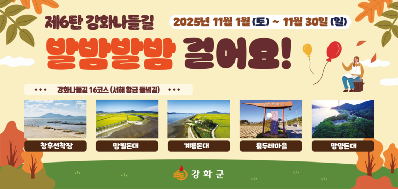 늦가을 정취 오롯이 느낄 수 있는 구간 [강화군 세계타임즈=심하린 기자] 강화군(군수 박용철)은 11월 한 달간 올해 마지막 강화나들길 스탬프 챌린지 ‘제6탄 강화나들길 발밤발밤 걸어요!’를 진행한다고 밝혔다.