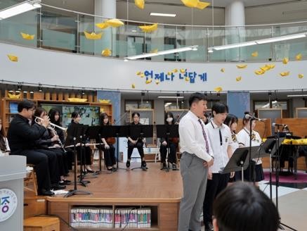 뒤이어 음악과 학생들의 관현악 합주에 맞추어 전교생이 함께 ‘천 개의 바람이 되어’를 제창하며 마음을 모았다.