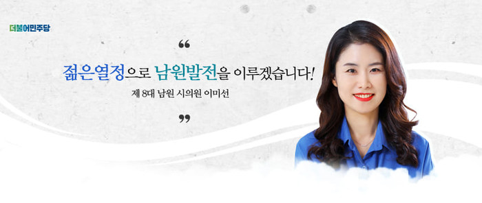 이미선 남원시의원은 전)전주시청 인권팀장, 20대 대선공약개발특별위원회 간사, 제8대 후반기 운영위원회 부위원장, 제8대 후반기 자치행정위원회 부위원장 등 다양한 활동을 하면서 쌓은 풍부한 경험과 능력을 기반으로 생활정치인이 되어 남원시 발전을 위해 헌신하고 있다.