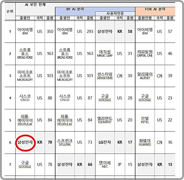 AI 보안기술의 10대 다출원 기업을 보면 IBM, 스트롱포스와 같은 미국 기업 9개사가 10위권 명단에 이름을 올렸고 한국 기업인 삼성전자가 6위로 7위 구글에 앞서며 유일하게 10위권에 진입했다.