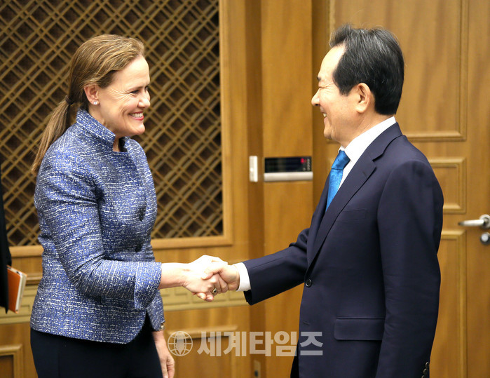 정 의장은 지난 주 도날드 트럼프 대통령의 국회연설 내용 및 한미동맹의 중요성을 언급하며, 북핵 문제 등 한반도 평화를 위해 미국의 바른 외교 정책의 수립에 기여해주길 바란다고 전했다.