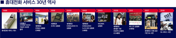 SK텔레콤(대표이사 사장 박정호, )의 전신인 한국이동통신이1988년 7월 1일 아날로그(AMPS: Advanced Mobile Phone Service) 방식 기술을이용해 휴대전화 서비스를 국내에 처음 선보인지서른해째다.