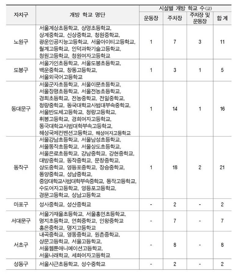 서울시교육청에서는 학교 주차시설 이용이 편리하도록 행정안전부 공유누리 서비스(www.eshare.go.kr)를 통해 주차시설 개방 정보를 제공하고, 네이버지도, 카카오맵, 티맵, 아이나비에어, 현대차네비게이션에서도 쉽게 알 수 있도록 정보를 제공할 예정이다.