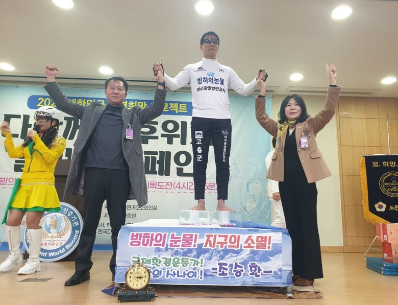 조승환 씨는 자신이 세운 세계기록보다 5분 늘어난 '4시간 45분'을 달성하고 앞으로 도전시간을 5분씩 늘려 UN 앞에서 7시간에 도전하는 그날까지 응원을 부탁한다”며, "얼음은 빙하를, 맨발의 사나이 발은 아픈 지구를 표현하는 극강의 퍼포먼스를 통해 전 세계인이 환경보호에 관심을 가지고 동참하면 좋겠다“고 말했다.