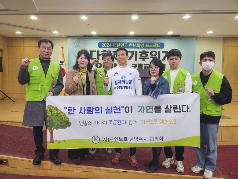 2월 19일 서울 여의도 국회 의원회관에서 (사)자연보호 남양주시 협의회(박순좌 회장)가 '한 사람의 실천이 자연을 살린다'는 슬로건으로 맨발의 사나이 조승환 씨와 함께 ‘다함께 기후위기 알리기 캠페인’에 참석하여 조승환 씨의 세계신기록 경신을 응원했다.