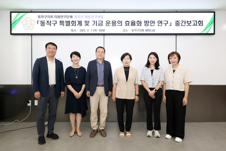 [동작구 세계타임즈=이장성 기자] 동작구의회(의장 정재천) 의원 연구단체 ‘동작구 재정 연구모임’(대표의원 김효숙)은 7일 의회 세미나실에서 중간보고회를 개최했다.