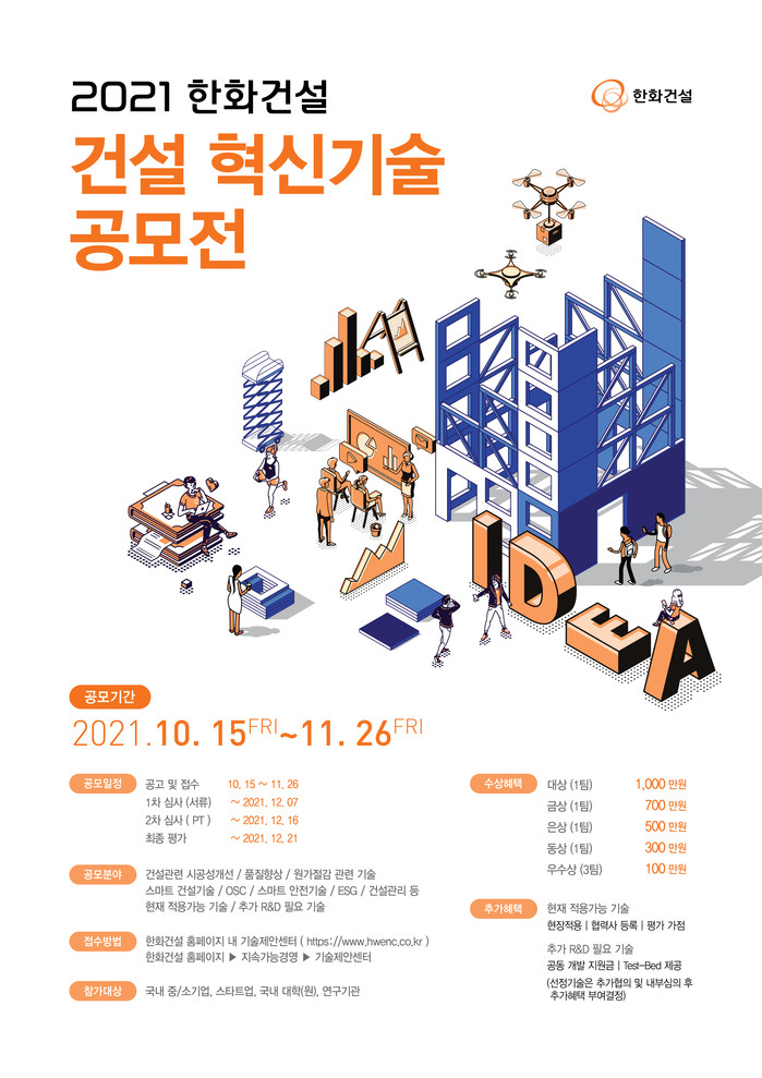 [세계타임즈 이진화 기자]한화건설이 우수한 건설기술 경쟁력을 지닌 중소 협력사와의 동반성장 및 기술협력을 강화하기 위해 ‘2021 한화건설 혁신기술 공모전’을 개최한다.