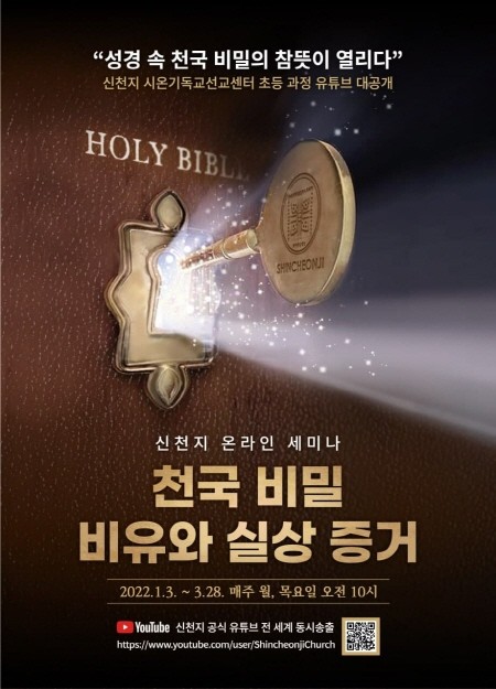 [세계타임즈 백진욱 기자] 신천지예수교 증거장막성전(총회장 이만희·이하 신천지예수교회)이 요한계시록 세미나에 이어 새해 1월 3일부터 ‘천국 비밀 비유와 실상 증거 세미나’를 시작한다. 이번 세미나는 천국에 대한 비밀을 비유로 감추었다가(마13:34~35) 때가 되면 밝히 알려주시겠다(요16:25)는 신약 성경 말씀 그대로 요한계시록이 성취된 때 천국 비밀 비유의 참 뜻을 성경에 의거하여 그 답을 명쾌하게 열어 전 세계에 전하는 자리다.