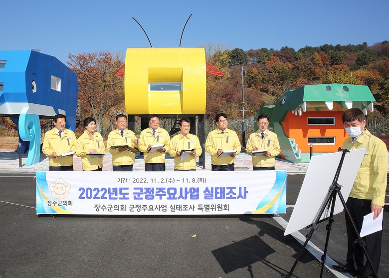군정주요사업조사 특별위원회(위원장 김남수)에서는 11월 2일, 3일 양일간 장수 누리파크 동물카라반 및 데크야영장 조성사업 등 관내 10개 사업장을 방문해 사업의 적정성 및 효과 등에 대하여 중점을 두고 실시했다.