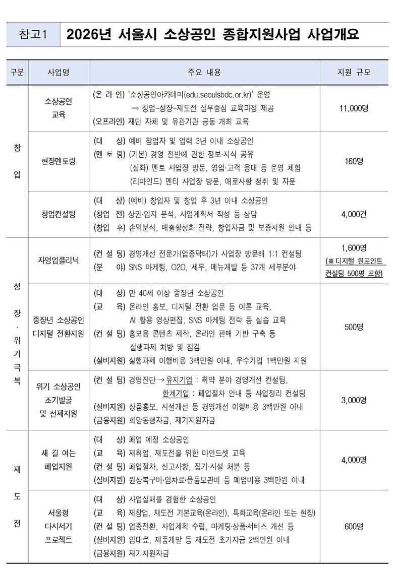 서울시는 「민생경제 활력 더보탬」프로젝트의 일환으로 소상공인 창업 준비부터 성장, 위기 극복, 재도전(폐업.재창업.재취업)까지 전 과정을 지원하는 ‘2026년 소상공인 종합지원’ 사업을 본격 가동에 들어간다고 밝혔다.