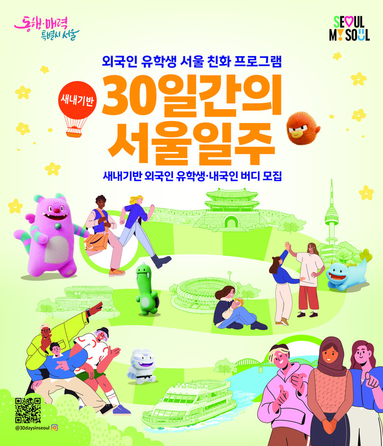 - 시, “유학생들의 유치-적응-정착으로 이어지는 전주기 지원 강화로 글로벌 인재 안착에 힘쓸 것” [서울 세계타임즈=이장성 기자] 서울시는 서울 체류 유학생 8만 명 시대를 맞이하며 시의 대표적인 외국인 유학생 안착 지원 프로그램 「30일간의 서울일주」를 더 알찬 구성으로 준비해 돌아왔다. 시는 4월 1일(수)부터 14일(화)까지 ‘2026년 30일간의 서울일주’ 프로그램 3기 참여자를 모집한다고 밝혔다.