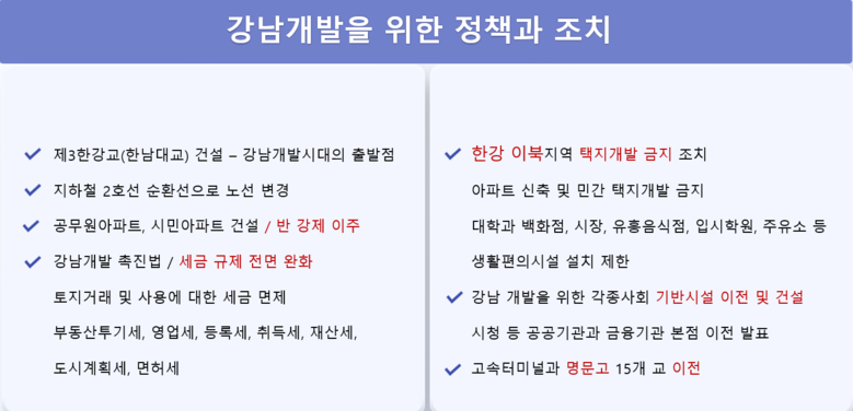 그에 더해 1975년, <한강 이북지역 택지개발 금지조치>를 통해 강북에는 아파트의 신축이 금지되었고 인구 집중을 유발하는 백화점‧시장‧대학 등의 새로운 입지를 제한했다.