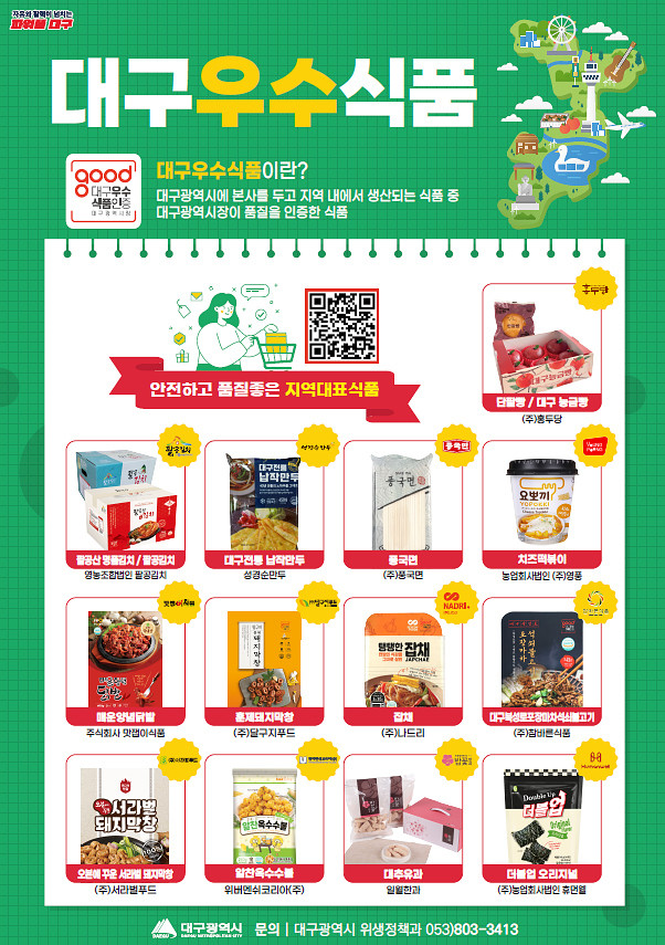 또한 ‘대구우수식품’의 경쟁력 강화와 판로 개척을 위해 △대형유통업체 특별판매전 운영 △대형마트 및 단체급식 시장 신규 진출 지원 △국내 대표 식품박람회 참가 지원 △수출 지원 정책 연계 등 실질적인 매출 증대로 이어질 수 있도록 체계적인 지원을 추진하고 있다.