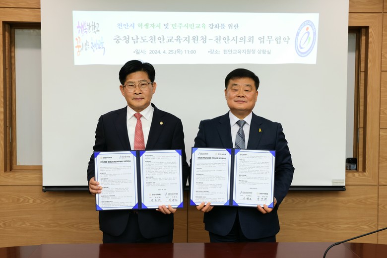 [천안시 세계타임즈=백택기 기자] 천안시의회는 25일 천안교육지원청과 청소년 사업의 효율적 업무추진을 위하여 MOU를 체결하였다. 그 간 천안시의회는 지역 내 청소년들의 민주 시민 의식 강화와 지방자치의 기능 및 역할에 대한 교육을 위하여 청소년 의회교실 및 청소년·어린이의회와 같은 교육 사업을 시행하여 왔다.