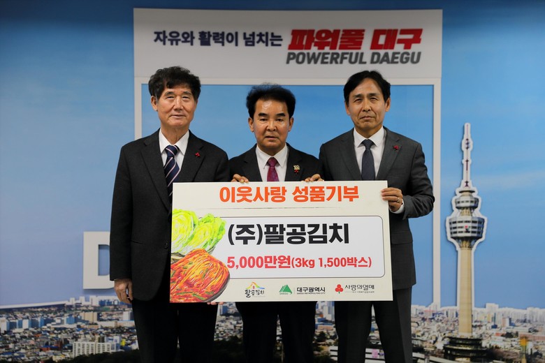 이재홍 대구광역시 보건복지국장은 “어려운 이웃들을 위해 꾸준히 기부 활동을 펼쳐온 영농조합법인 팔공김치에 깊은 감사를 표한다”며 “이번에 기탁된 배추김치는 어려운 이웃들에게 따뜻한 위로가 될 수 있도록 소중히 전달하겠다”고 말했다.
