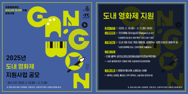 [강원도 세계타임즈=김민석 기자] 강원문화재단(대표이사 신현상)은 “2025년 도내 영화제 지원 사업” 공모에 참여할 단체를 모집한다고 밝혔다.