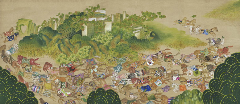 작가는 이런 책가도의 기능을 염두에 두고 호렵도에서 채취한 말의 도상에 전통적인 길상의 소재들을 하나씩 입혔나갔다. 화면 오른쪽에서 출발해 왼쪽 끝 사랑의 문을 향해 달려가는 80여 마리의 말은 모란, 연화, 매화, 백호, 봉황, 나비, 영지, 소나무, 천도, 구름, 해, 산 등의 문양과 ‘기쁨-囍(쌍희)’ ‘장수-壽(목숨수)’ ‘성스러움-聖(성스러울성)’ 같은 길상 문자로 장식된 마의(馬衣)를 둘렀다. 거기에 태극기를 비롯해 조각보, 단청 등의 전통 문양, 스웨덴의 목마인 달라호스 등 다양한 디자인 패턴을 더했다. 비단의 광택이나 문양을 수놓은 바느질 땀을 표현한 것도 보인다.