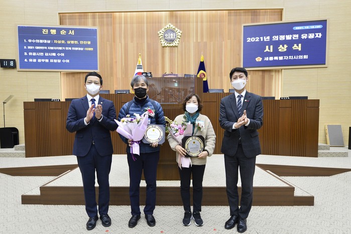 [세종=세계타임즈 이채봉 기자] 세종특별자치시의회(의장 이태환)는 15일 본회의장에서 제72회 정례회 폐회 직후 ‘2021년 의정발전 유공 시상식’을 개최하고 시민 27명과 공무원 4명에게 감사패 및 표창장을 수여했다.
