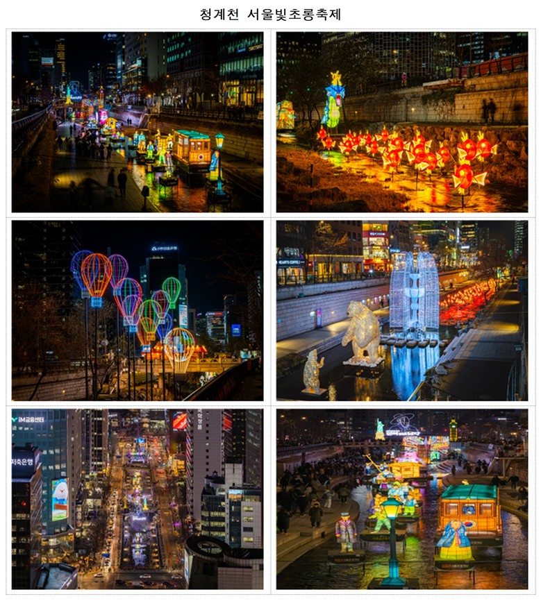 ○ (청계천) ‘서울빛초롱축제’는 도심 속 물길을 따라 빛의 산책로를 즐기려는 시민들로 북새통을 이루고 있다. 형형색색의 등불과 빛 조형물이 겨울밤의 운치를 더하며 가족·연인 단위의 관람객들에게 큰 호응을 얻고 있다.