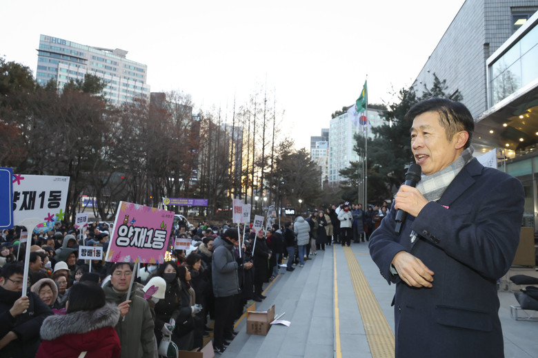| ▲ 전성수 서초구청장(가운데)이 주민들과 새해 인사를 나누는 모습 |