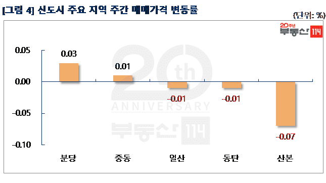 신도시는 △분당(0.03%) △중동(0.01%)은 상승한 반면 ▼산본(-0.07%) ▼동탄(-0.01%) ▼일산(-0.01%)은 떨어졌다. 분당은 최근 거래가 활발하게 이뤄진 정자동 상록우성이 500만원-1,500만원 올랐다. 중동은 중동 보람아주가 250만원 상승했다. 반면 산본은 산본동 한라주공4단지가 500만원 내렸고, 동탄은 능동 동탄푸른마을신일해피트리와 동탄푸른마을두산위브가 500만원-1,000만원 떨어졌다. 일산은 3기신도시 발표 후 시장침체가 이어지면서 백석동 힌돌1단지금호타운이 1,000만원 빠졌다.