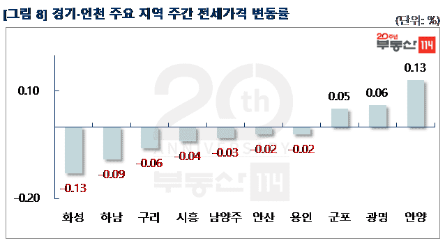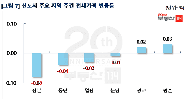 신도시는 ▼산본(-0.08%) ▼동탄(-0.04%) ▼일산(-0.03%) ▼분당(-0.01%) 순으로 떨어졌다. 산본은 송정지구 2,000여 가구 입주가 전 지역에 영향을 미치면서 산본동 한라주공4단지가 500만원 하락했다. 동탄은 능동 푸른마을포스코더샵2차가 1,500만원 내렸고, 일산은 주엽동 문촌16단지뉴삼익, 강선14단지두산이 각각 500만원씩 떨어졌다. 분당은 비수기를 맞아 거래가 정체되면서 서현동 시범한양과 효자임광이 250만원-1,000만원 하락했다. 반면 △평촌(0.03%) △광교(0.02%)는 올랐다.