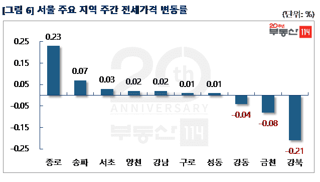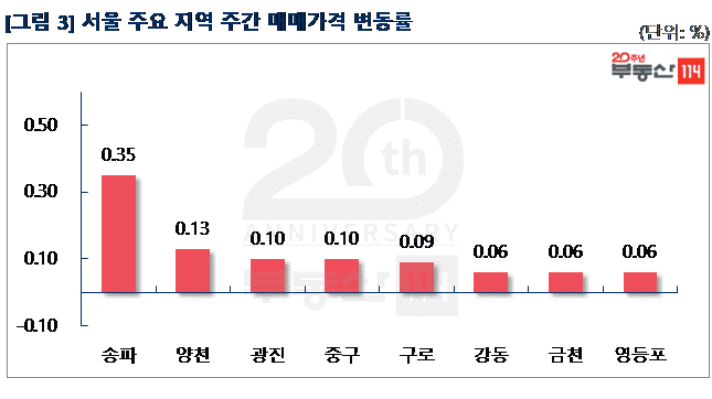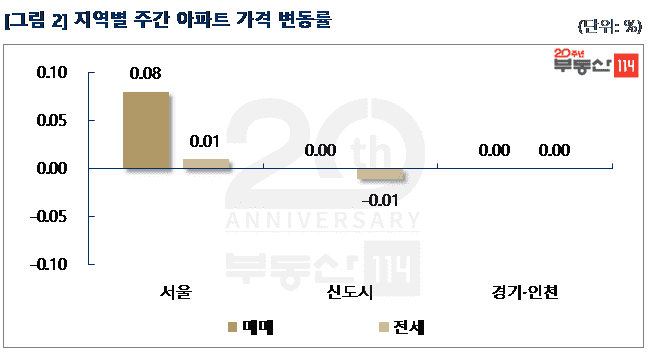 부동산114(www.r114.com)에 따르면 금주 서울 아파트가격 변동률은 0.08%를 기록했다. 재건축 아파트(0.10%)와 일반 아파트(0.08%)가 전주 대비 상승폭이 각각 0.01%p씩 낮아졌다. 신도시와 경기ㆍ인천은 지난 주와 마찬가지로 보합(0.00%)을 기록했다.